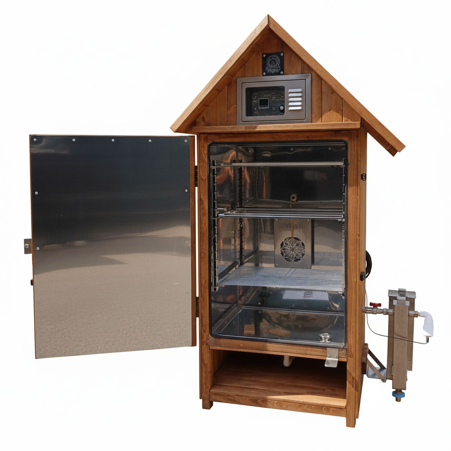 Díky nainstalovanému ventilátoru, který přivádí čerstvý vzduch do komory při zapnutém režimu sušení, se osušení značně urychlí. Tím se lišíme od jiných udíren, jelikož nepotřebujete zvláštní box nebo komoru na sušení. Na dně udírny je sliv, kudy odtéká voda. Mytí se tím značně usnadňuje.